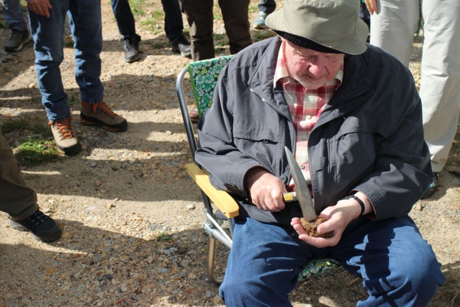 31 Interessierte fanden sich am Parkplatz ein. Zuerst ging es den Kellerberg hinauf um das Bergwerk von außen zu betrachten. In Rotkot wurden sulfidische Erze abgebaut, insbesondere Magnetkies (Pyrit) und Kupferkies (Chalkopyrit), aber auch Bleiglanz (Galenit) und Zinkblende (Sphalerit). Daneben wurden auch Vitriol, Alaun und "Roterfarb" gewonnen, die ebenfalls mit den sulfidischen Erzen zusammenhängen.
