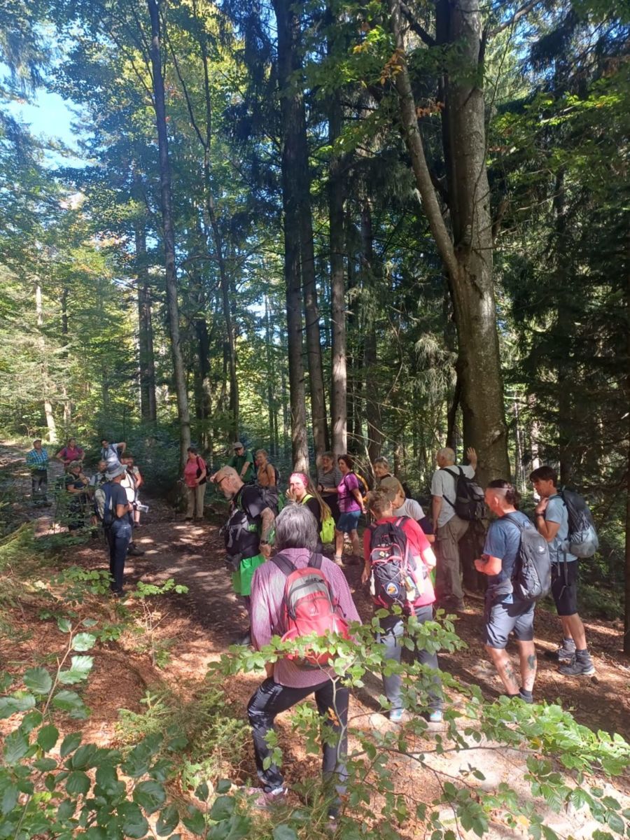 In den strukturreichen Hochlagenwäldern erläuterte Ranger Emanuel Hackl die Bedeutung naturnaher Wälder für das Auerhuhn. Dieser Waldvogel ist auf den mosaikartigen Lebensraum alter Wälder mit einem großen Totholzanteil, aber auch mit lichten bzw. freien Flächen angewiesen. Besonders anfällig gegenüber Störungen ist diese Art im Winter. In der kalten Jahreszeit steht ihr nur energiearme Nahrung wie Fichten- und Tannennadeln zur Verfügung. Werden die Auerhühner in dieser Zeit zum Beispiel von Menschen abseits der Wege gestört und müssen fliehen, verbrauchen sie mehr Energie als sie durch die karge Nahrung wieder aufnehmen können. Bei wiederholten Störungen kann das bis zum Tod der Tiere führen. Deshalb ist unsere Rücksichtnahme für das Überleben der Tiere entscheidend. Des Weiteren profitieren auch andere Tier- und Pflanzenarten, welche auf einen naturnahen Wald angewiesen sind, vom Schutz des Auerhuhns.