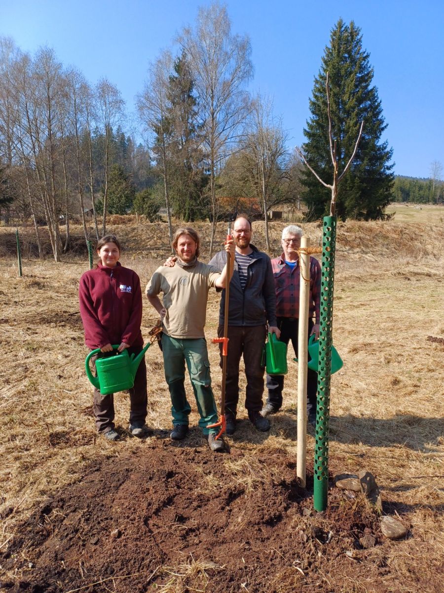 Zwiesel. Im Rahmen der Naturpark Fortbildung „Frühjahrspflanzung robuster Obstbaumsorten“ der Umweltstation Bayerisch Eisenstein am 18. März 2026 in der Seebachschleife drehte sich alles um alte Obstbaumsorten, die klimatisch raueren Bedingungen Stand halten können. Gemeinsam mit Dipl. Ing. Christoph Pfeffer und dem Gartenbau Experten des Landratsamtes, Martin Straub veranstaltete der „Naturpark Bayerischer Wald“ eine informative Pflanzaktion für interessierte Teilnehmer. Nachdem der gewünschte Standort auf dem Damm zwischen dem Großen Regen und dem Kanal von Martin Straub in Augenschein genommen worden war, begannen alle die Pflanzlöcher auszuheben und stießen schnell auf solch steinigen Untergrund, dass der ursprüngliche Plan umgeändert werden musste. Der neue Platz war schnell auf der darunter liegenden Wiese gefunden, entlang des Straßensaumes. Dort wurden dann mit vereinten Kräften 5 Pflanzlöcher ausgehoben und anschließend 5 verschiedene Sorten, 3 Äpfel und 1 Birne und 1 Zwetschge gepflanzt. Aus dem „roten Mond“, einer alte russischen Apfelsorte, gingen einst alle Apfelsorten mit rot eingefärbtem Fruchtfleisch hervor, weiß Martin Straub zu berichten. Dies ist nur eine Besonderheit, die nun in der Seebachschleife der Öffentlichkeit zugänglich sein wird. Dieser Aspekt war Christoph Pfeffer besonders wichtig, dass das Obst allen Wandernden und Ortsansässigen frei zur Verfügung stehen soll. Eine entsprechende Beschilderung mit Hinweisen zu den einzelnen Sorten und wann diese wirklich reif sind zur Ernte, wird in Kürze angebracht werden. Die unterschiedliche Obstbäume dienen dem Sortenerhalt und erhöhen zudem die Biodiversität im Dorf, dies war für die Naturparkmitarbeiterin Christina Frank wichtig.