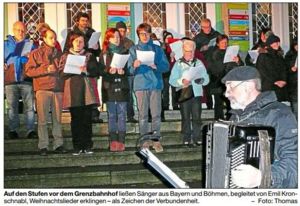 Nachdem letztes Jahr vor der Kirche in Železná Ruda gesungen wurde, trifft man sich heuer wieder vor dem Grenzbahnhof. Herzlich eingeladen sind alle Freunde Böhmens, die gemeinsam ein Zeichen der Verständigung und Zusammengehörigkeit setzen wollen. Es werden auch Mitglieder des gemischten Eisensteiner Chores erwartet, eventuell schaut auch der Bayerische Rundfunk vorbei. Zum Aufwärmen gibt es Glühwein bei einem gemütlichen Beisammensein im Weinkeller des Bahnhofs und natürlich darf dann bei Musikbegleitung auch weiter gesungen werden.bbz