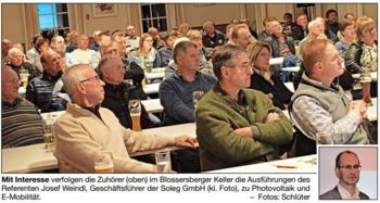 Viechtach. „Strom erzeugen und selbst nutzen“ – das Thema kommt an, denn bereits eine halbe Stunde vor Veranstaltungsbeginn füllte sich der große Saal im Blossersberger Keller. Zur Freude von Dr. Wolfgang Schlüter, Leiter des Arbeitskreises Energie und Verkehr, der die Teilnehmer im Namen des Klimanetzwerkes begrüßte, einem Zusammenschluss des Arbeitskreises mit der Umweltstation Viechtach (Naturpark Bayerischer Wald), die durch Matthias Rohrbacher vertreten war. Es referierte Josef Weindl, ein Pionier in Sachen Sonnenenergie und Geschäftsführer der Soleg GmbH.