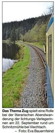 Der Abend zum Thema Mobilität und Natur steht unter dem Titel „Nimm den nächsten Luftzug“. Diese Zeile ist einem Gedicht der Regensburger Schriftstellerin Barbara Krohn entnommen. Treffpunkt ist um 18.30 Uhr am Bahnhaltepunkt Schnitzmühle, Interessenten können daher auch per Bahn kommen (Abfahrt Bahnhof Viechtach 17.37 Uhr, Ankunft Schnitzmühle 17.41 Uhr, Abfahrt Gotteszell 17.38 Uhr, Ankunft Schnitzmühle 18.18 Uhr).
