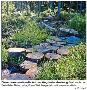 Arbergebietsbetreuer Johannes Matt vom Naturpark hat den Weg besichtigt und war begeistert. Matt meinte in einem E-Mail an den Bodenmaiser Bürgermeister: „Könnten Sie bitte Herrn Franz Weinberger ausrichten, dass ich die Instandsetzung des Wanderweges Nr. 1 unterhalb des Mittagsplatzl für gut gelungen halte. Einfach und originell gelöst. Sehr gut, dass keine Verrohrungen und keine Kiesaufschüttungen vorgenommen wurden.“