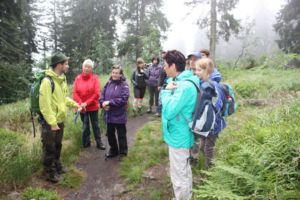 Die verschiedenen Phasen eines Waldes von der Verjüngungs- über die Optimal- und in naturnahen Wäldern bis hin zur Alters- und Zerfallsphase konnten bei der Wanderung gesehen und durch die Hintergrundinformationen in einen Zusammenhang gebracht werden. Das dort vorkommenden, aber bedrohte Auerwild ist auf einen genau solchen strukturreichen Lebensraum, der alle Phasen des Waldzyklus mosaikartig vereinbart, angewiesen. Von den kräftig wachsenden Heidelbeersträuchern ernähren sich im Sommer nicht nur die Auerhühner, sondern auch die Wanderer nutzten sie als Stärkung am Wegesrand. Das Massiv des Arbers stellt einen wichtigen Teil des Auerwildlebensraumes dar, für dessen Schutz und Erhalt neben dem Auerwildschutzgebiet, dem Wegegebot auch die Rücksicht der Wanderer notwendig ist. Darüber hinaus konnten sich die Teilnehmer am Anblick von bizarren Baumgestalten, verschiedenen Baumpilzen und auch des blühenden Ungarischen Enzians erfreuen.
