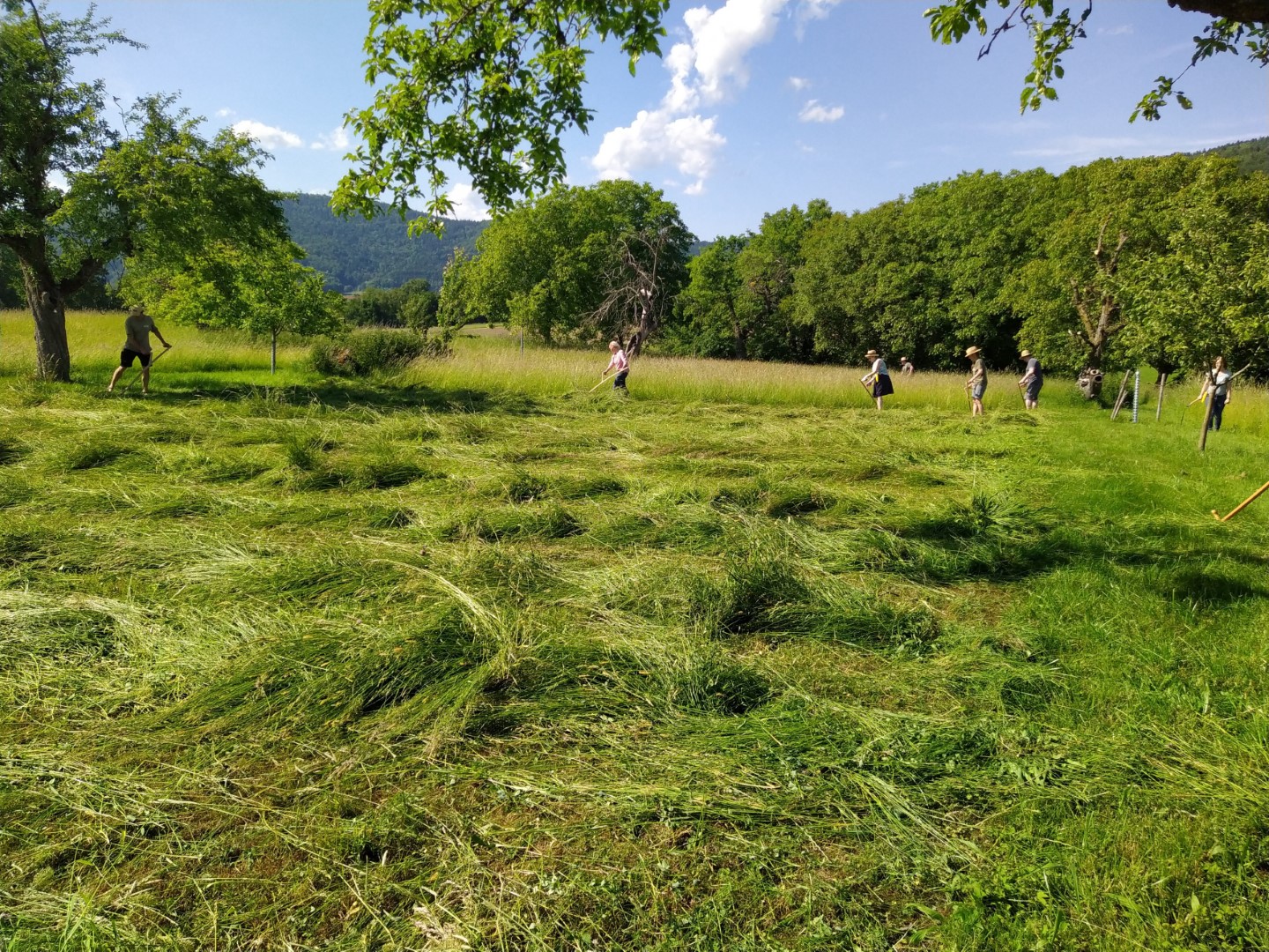 Vor Ort wurde dann gedengelt – eine der wichtigsten Arbeiten für eine dauerhaft scharfe Schneide. Anhand von Blechstücken und Übungssensen konnten die Teilnehmenden unterschiedliche Dengelstöcke ausprobieren und sich mit der Methodik vertraut machen, bevor es an die eigentlichen Sensen ging. Zellner nahm den Teilnehmenden die Scheu vor Fehlern und verdeutlichte, dass jeder mit etwas Übung das Dengeln erlernen kann. Er betrachtete auch die mitgebrachten Sensen der Teilnehmenden und gab wertvolle Tipps zur Pflege und Wiederaufbereitung alter Klingen, die oft seit vielen Jahren unbenutzt in Scheunen liegen. Mit etwas Aufmerksamkeit lassen sich diese wieder in hervorragenden Zustand versetzen.