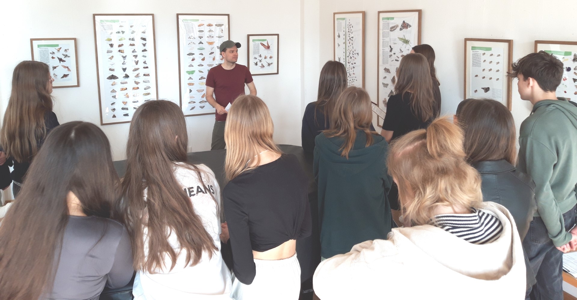Gefragt nach ihrem Vorwissen über Nachtfalter mussten die Schüler der 8. Jahrgangsstufe des Johannes-Gutenberg-Gymnasiums im Foyer des Haus der Natur, Kultur, Kunst und Jugend zu Beginn ihres Besuchs noch passen. Dort hieß der Leiter der Naturpark-Umweltstation Waldkirchen Johannes Matt sie zu einer geführten Besichtigung der Nachtfalter- und Lichtverschmutzungsausstellung willkommen. Nach einem kurzen einführenden Film waren die Schüler aufgerufen, in Kleingruppenarbeit die Inhalte der Nachtfalter-Ausstellung zu erarbeiten und ihren Mitschülern anschließend kurz zu präsentieren.