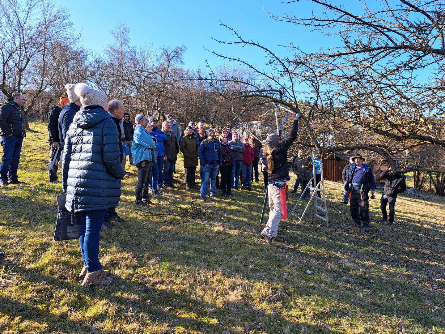 Zu Beginn erhielten die Teilnehmenden Tipps zum richtigen und qualitativ hochwertigen Werkzeug. Die beiden Referenten stellten hierfür die Vor- und Nachteile der mitgebrachten Werkzeuge dar. Anschließend zeigten Straub und Meyer die Grundregeln des Baumschneidens an einem großen, alten Apfelbaum. „Nicht irgendwo schneiden“ war oberstes Gebot, da sonst beim Stehenlassen von „Stummeln“ Krankheitserreger eindringen können und Faulstellen entstehen. Gemeinsam wurde der Apfelbaum dann mit vielen beherzten Schnitten ausgelichtet. Dabei wurden nach unten wachsende oder sich kreuzende und beschädigte Äste entfernt. Die wissbegierigen Teilnehmenden halfen tatkräftig mit und nach etwa einer Stunde war der Baum kaum wiederzuerkennen. Eine licht- und luftdurchlässige Krone war entstanden, ganz nach der alten Gärtner-Regel: „Durch einen geschnittenen Apfelbaum muss man einen Hut werfen können.“ Anschließend ging es einem jüngeren, sehr buschigen Birnbaum, dessen Haupttrieb einmal gekappt wurde, ans Geäst. Auch ein erst kürzlich gepflanztes Bäumchen wurde einem Erziehungsschnitt unterzogen. Abschließend nutzte man noch die Gelegenheit den Spezialisten Fotos eigener Bäume zu zeigen und Pflegetipps einzuholen, ehe es Heim ging, um das Gelernte zielsicher in die Tat umzusetzen.