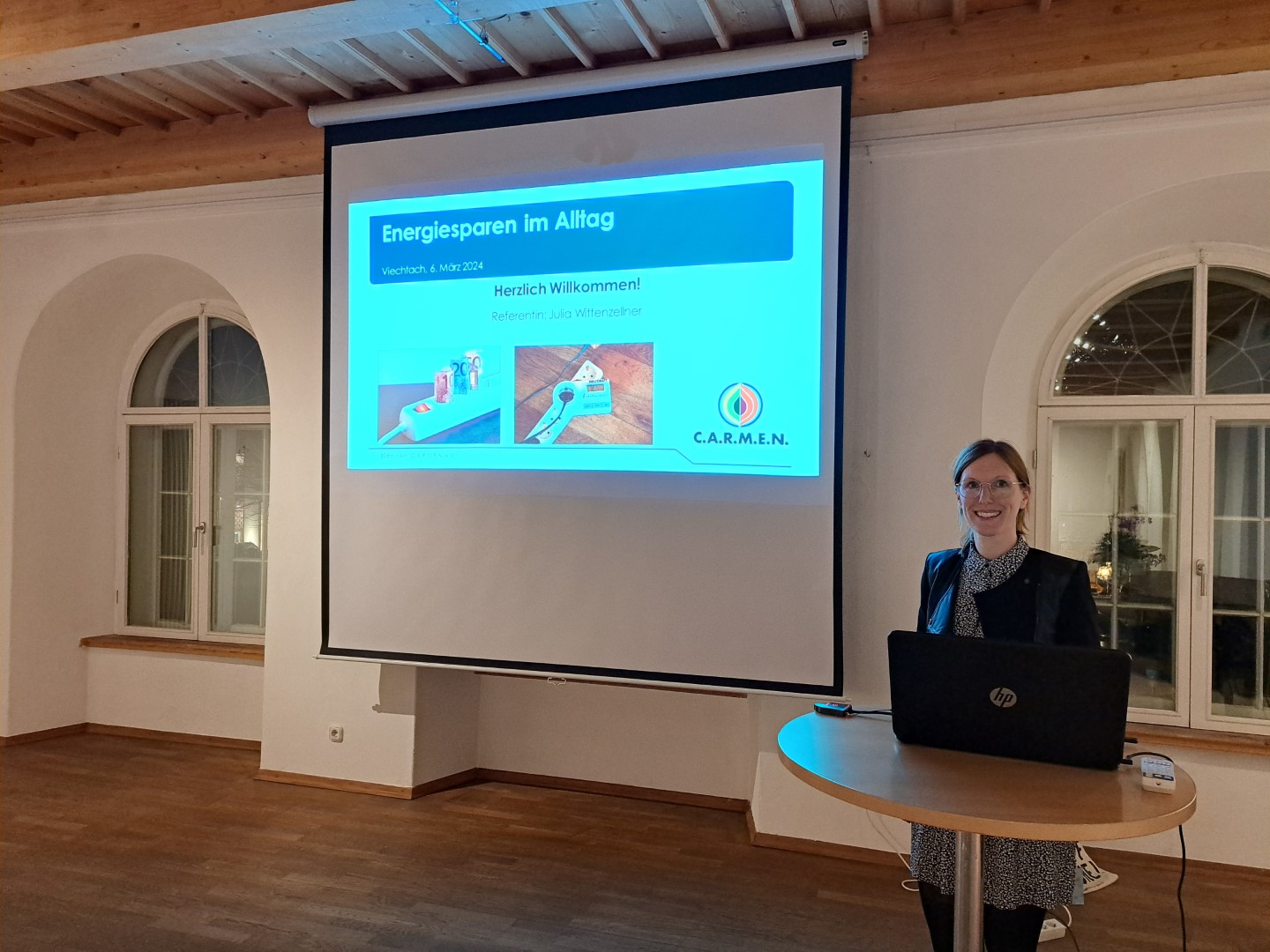 Am Mittwoch, den 06. März präsentierte Julia Wittenzellner vom C.A.R.M.E.N. e.V. in Straubing im Alten Rathaus in Viechtach wertvolle Tipps zum Energiesparen im Alltag. Ihr Vortrag bildete den Auftakt zu einer kostenlosen, fünfteiligen Veranstaltungsreihe zum Thema Nachhaltigkeit von der Umweltstation Viechtach und der Katholischen Erwachsenenbildung. Da es für die meisten Menschen selbstverständlich ist, dass immer und überall ausreichend Energie zur Verfügung steht, motivierte Wittenzellner den eigenen Energieverbrauch genauer unter die Lupe zu nehmen. Die Preisentwicklungen am Gas- und Strommarkt zeigen in aller Schärfe den Handlungsbedarf jedes Einzelnen. Die Teilnehmer bekamen einen detaillierten Überblick über einfache Maßnahmen, die sich ohne großartige Einschränkungen und Kosten in den Alltag integrieren lassen. Wittenzellner ging dabei auf verschiedenste Bereiche wie Haushaltsgeräte, Beleuchtung, Unterhaltungstechnik, Gebäude und Heizung oder Mobilität ein. Vor allem der Bereich der Unterhaltungstechnik weist den höchsten Energieverbrauch in den Haushalten auf. Durch kleine Verhaltensänderungen wie stetes Kochen mit Topfdeckel oder der richtigen Befüllung der Waschmaschine kann Energie und somit bares Geld gespart werden. Dies trägt wiederum zum Schutz des Klimas bei.