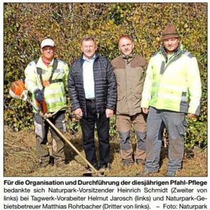 Der Naturparkvorsitzende Heinrich Schmidt bedankte sich bei den engagierten Tagwerk-Arbeitern und den Verantwortlichen des Bayerischen Roten Kreuzes für die gute Zusammenarbeit: „Der Naturschutz- und Erholungswert der einzigartigen Pfahlgebiete kann mit der Pflege erhalten und verbessert werden“, so Schmidt. Die Bedeutung des Pfahls als überregional bekanntes Naturdenkmal und Bayerns „Geotop Nummer eins“ gleiche einem Wahrzeichen für die gesamte Region.ro