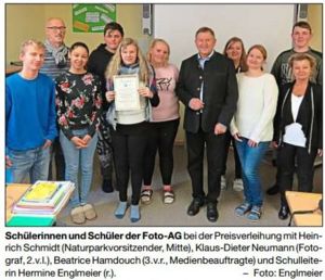 Heinrich Schmidt, erster Naturparkvorsitzender und Leiter der Umweltstation Viechtach, bedankte sich bei den Schülern und bei der Klassenlehrkraft Beatrice Hamdouch für das Engagement. Die Jugendlichen können sich nun über einen kostenlosen Eintritt in die NaturparkWelten im Grenzbahnhof Bayerisch Eisenstein mit Verzehrgutschein im historischen Bahnhofsrestaurant freuen. Angetan von dem Siegerpreis war auch Schulleiterin Hermine Englmeier, die sich besonders bei Matthias Rohrbacher, dem Naturpark-Gebietsbetreuer, beim Vorsitzenden Heinrich Schmidt und bei Fotograf Klaus-Dieter Neumann für die gute und gewinnbringende Zusammenarbeit bei vielfältigen gemeinsamen Projekten bedankte.