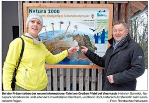Naturparkvorsitzender Heinrich Schmidt freute sich über diese weitere Möglichkeit der Besucherinformation am Großen Pfahl: „Die Natura-2000-Gebiete werden dadurch wieder mehr in das Blickfeld der Öffentlichkeit gerichtet. Wir werden weiterhin die Pflege und der Erhalt dieser Pfahlgebiete mit dem der Stadt Viechtach durch den Naturpark organisieren und die Kosten größtenteils über Naturpark-Fördermitteln finanzieren“. ro